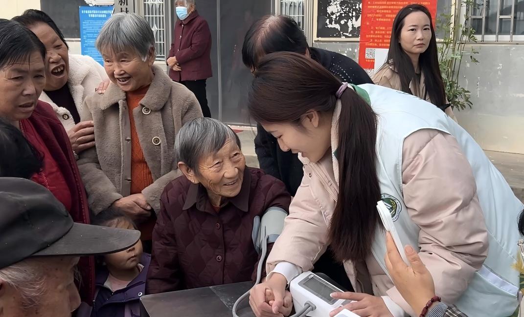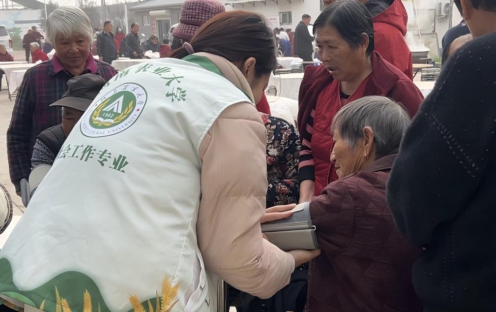 活动当天,我院研究生团队结合社会工作专业优势,提前协助村委进行活动策划与现场布置,确保活动流程有序进行。活动伊始,我院两位研究生为到场的老年人测量血压、记录健康数据,并运用所学的健康社会工作知识向老人们讲解慢性病预防与日常健康管理要点,耐心解答老人们在生活中遇到的健康困惑。同时,研究生们还与村干部共同参与“好婆婆奖”“好媳妇奖”的颁发环节,用专业视角观察并总结社区长者间的家庭互助与情感支持,为后续社区和谐建设提供实践经验。