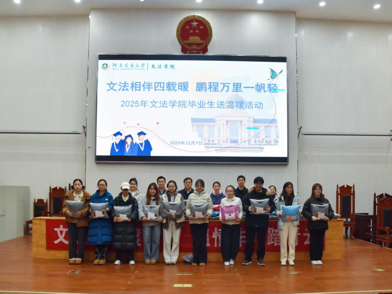 本网讯(通讯员 韩金露 图片 吕设龙 张晨翔)立冬寒意浓,关怀暖人心。11月7日立冬,我院在龙子湖校区模拟法庭举办“文法相伴四载暖,鹏程万里一帆轻”毕业生送温暖活动。院党委书记赵宁,院党委副书记朱瑞萍,团委书记王鹏举、研究生辅导员郑亚豪及本科生辅导员盛戈出席活动,25级研究生与本科毕业生参加。