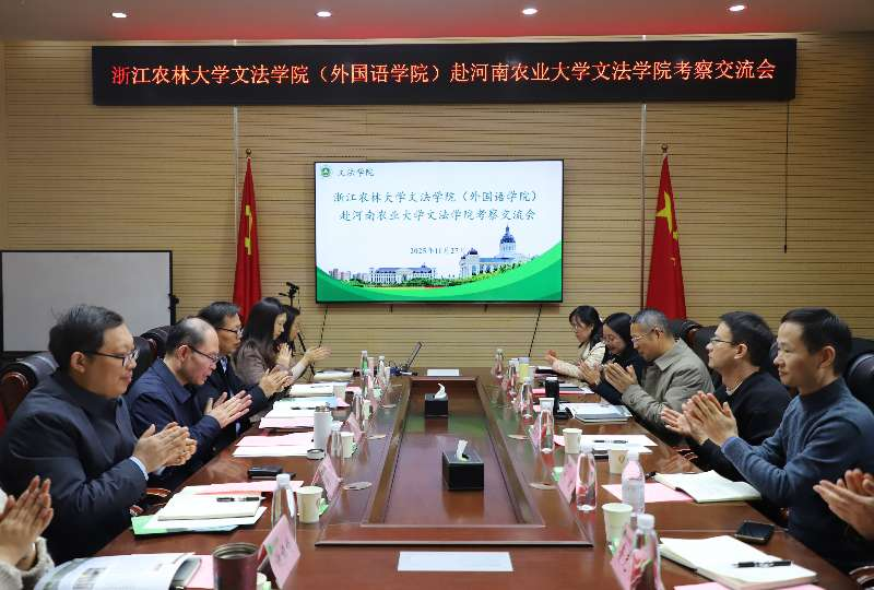 本网讯(通讯员 张秉全 图片 张秉全)11月27日,浙江农林大学文法学院(外国语学院)鲁可荣院长一行来到我院考察交流。两校同为农林类高校,在推进文科专业建设、服务乡村振兴战略、构建“文科+农业农村”特色发展体系方面拥有高度的共通性与互补性。本次交流旨在进一步拓宽农林高校文科建设的视野,深化人文社科服务农业农村现代化的路径探索,为推动中国特色农业高等教育高质量发展贡献“文法智慧”。