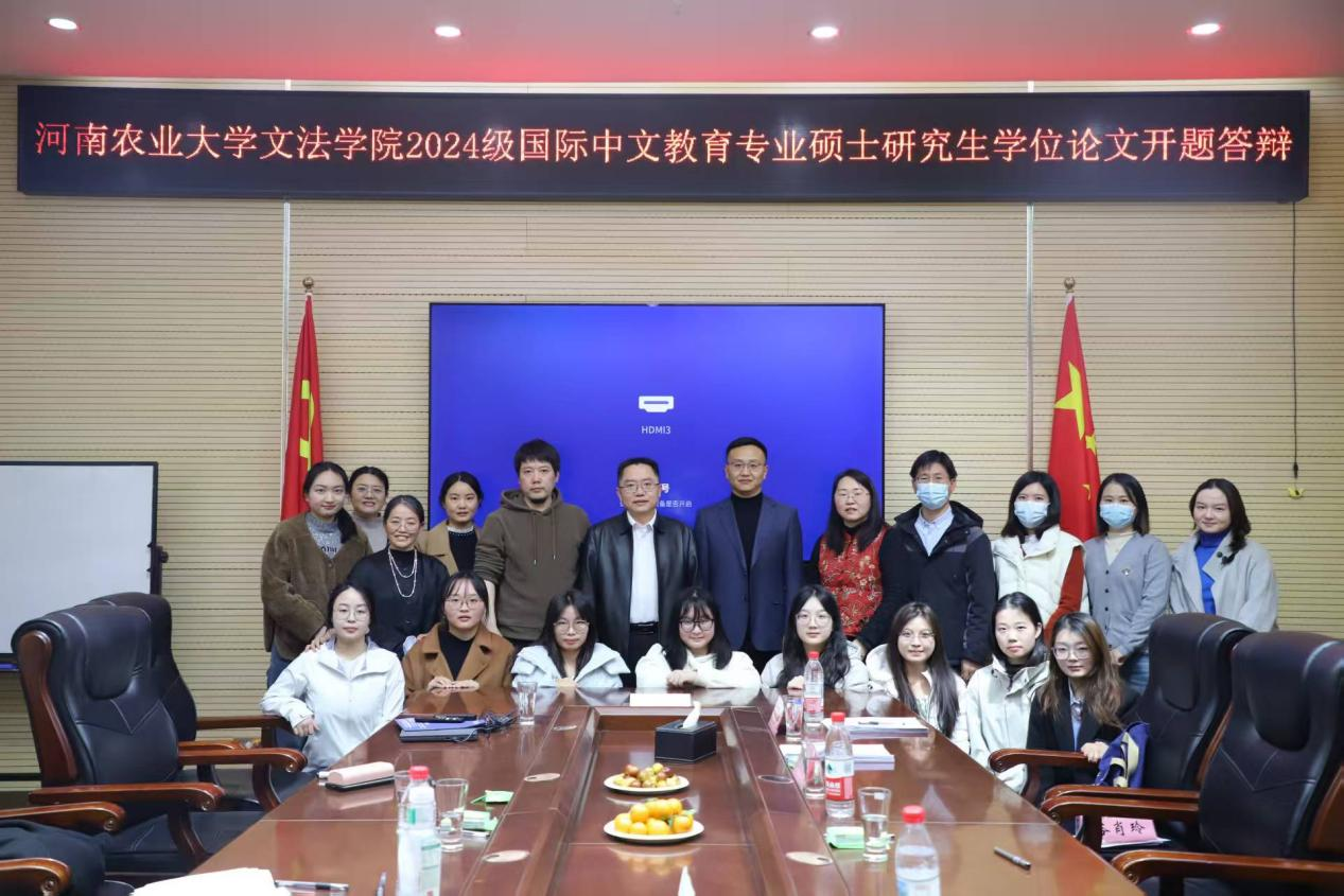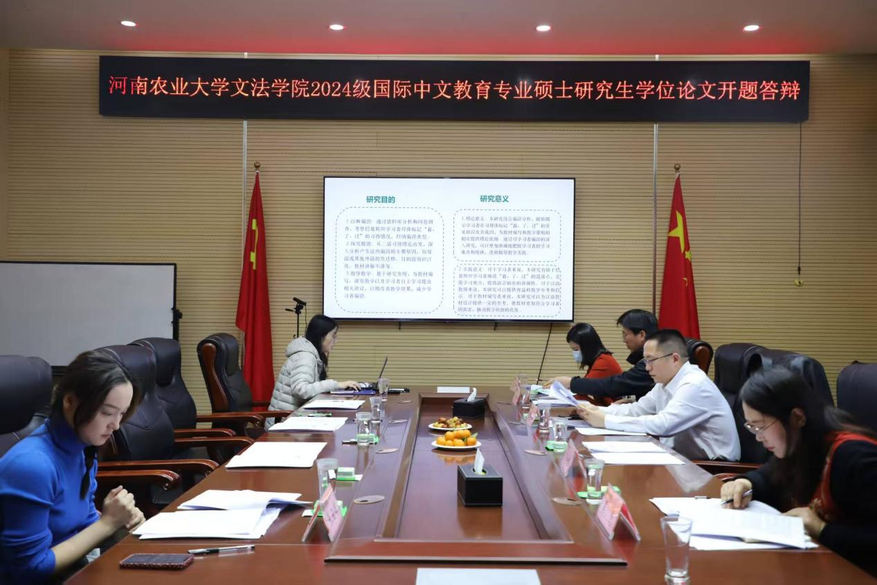 本网讯(通讯员 黄美华)为扎实推进国际中文教育硕士研究生培养工作,把好学位论文质量第一道关口,我院于11月29日在繁塔楼A405会议室、繁塔楼A306会议室举行了2024级国际中文教育硕士研究生学位论文开题答辩会。本次开题报告会特邀河南农业大学副校长张朝阳担任答辩委员会主席,校外专家高升及国际中文教育硕士研究生导师担任答辩委员。