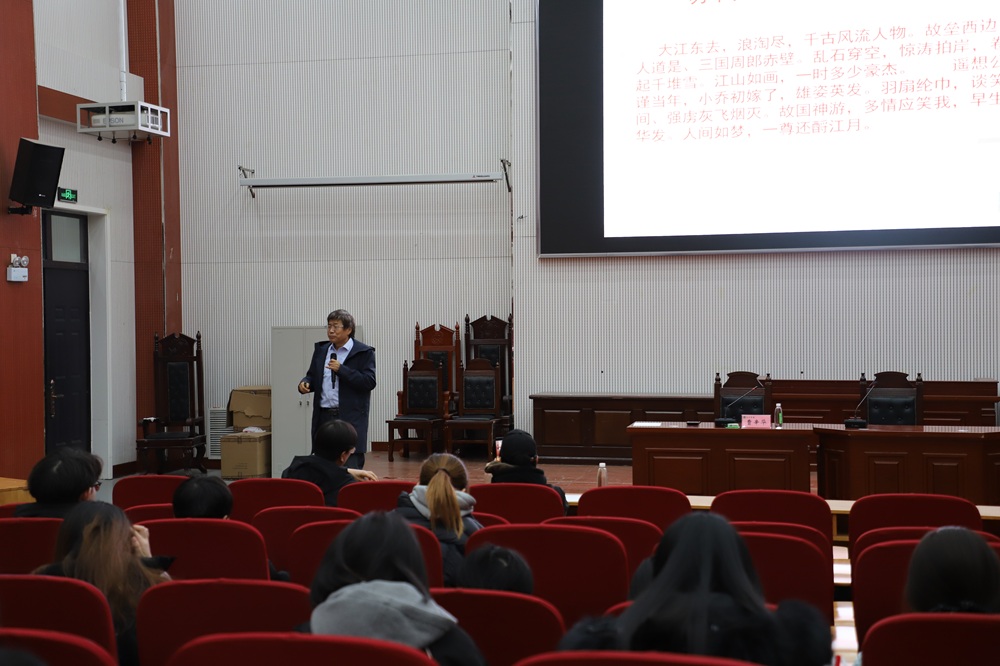 本网讯(通讯员 牛志威)12月1日,上海大学中华诗词创作研究院院长、二级教授、博士生导师曹辛华应邀在模拟法庭作题为“唐宋词体原理的当代运用——新格律词创作问题”的学术讲座。讲座由我院汉语言文学系主任刘华主持,汉语言文学系部分教师和学生参与讲座。