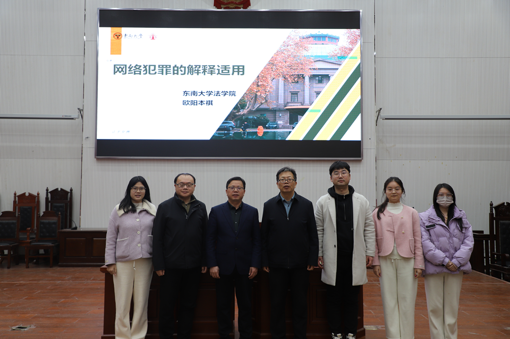 本网讯(通讯员 杜辉)12月8日,东南大学法学院教授、博士生导师、东南大学网络安全法治研究中心主任欧阳本祺应邀在模拟法庭做题为《网络犯罪的解释适用》的学术报告。讲座由我院副院长、法学学科带头人杨红朝教授主持,法律系的部分教师、本科生、研究生参与讲座。